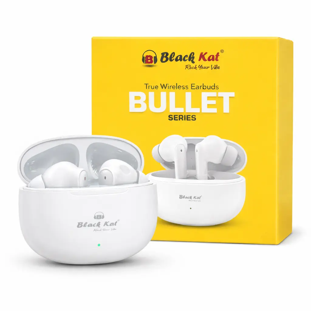 Black Kat Bullet Series TWS Earbuds are stylish wireless earbuds designed for daily use with clear sound, deep bass, and long battery life. These earbuds offer smooth Bluetooth connectivity and comfortable fit for music and calling.