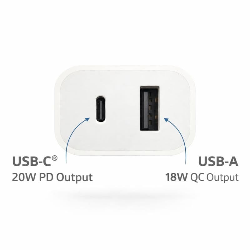 This charger has an additional feature of having two ports to charge two devices simultaneously via the Type C/USB Type A ports available on the charger. These ports have the power delivery feature for Type C devices and feature a device with quick charge capabilities on the other end. This implies that the devices can charge faster compared to other standard chargers.