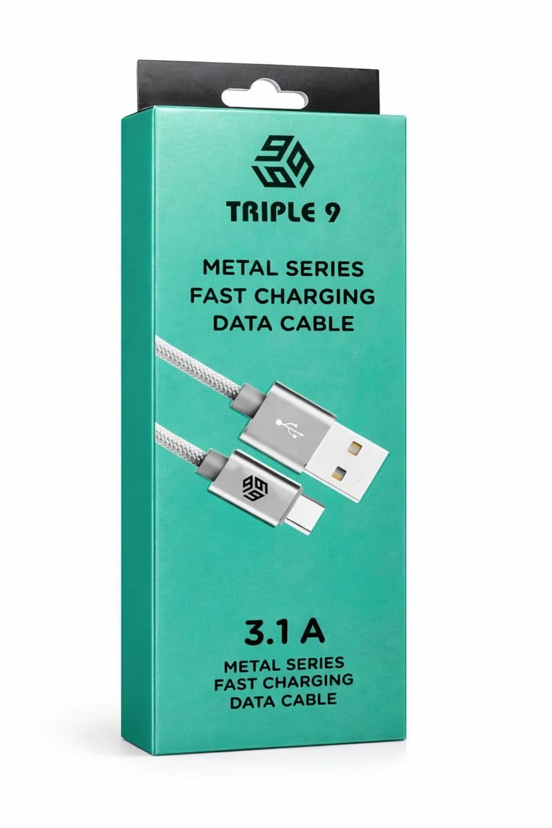 Triple 9 Metal Series Type-C fast charging data cable with 3.1A output. Strong metal connector, smooth flexible wire, and reliable performance for daily charging and data use.